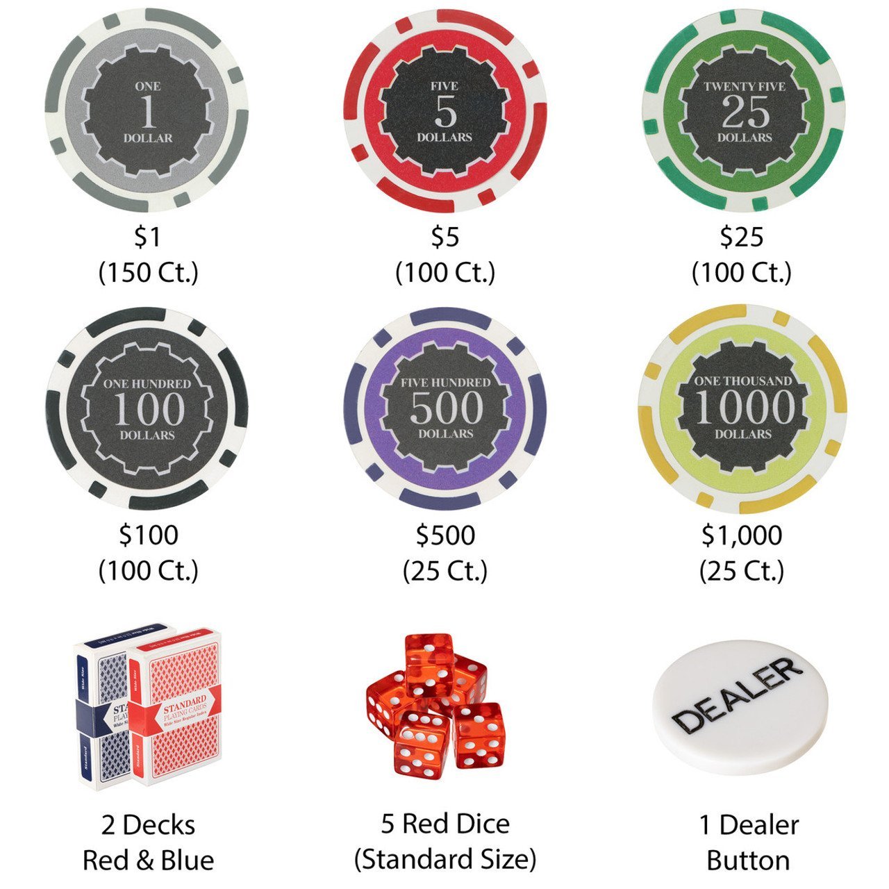 In this set you will receive 500 14 gram chips, a 500 ct Aluminum case, 2 decks of cards and a dealer button.