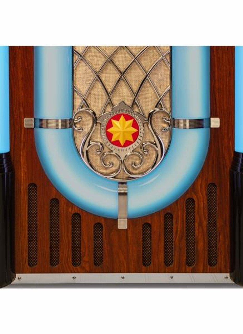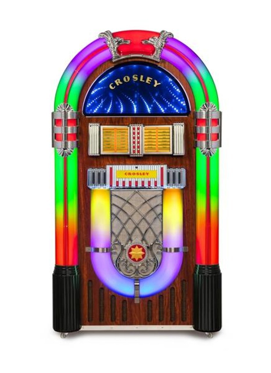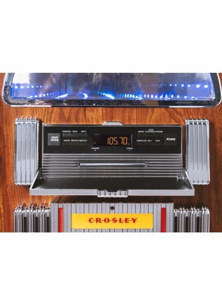 Revel in the nostalgic beauty of a colorful jukebox while enjoying the latest technological advances. This LED-powered Bluetooth-enabled jukebox can connect with any Bluetooth device (such as a tablet or phone) to stream your favorite playlists and songs to the four built-in stereo speakers. Add a set of external speakers if you need additional sound to fill almost any room. Tune in to your favorite stations with the digital AM/FM radio tuner or play your favorite CDs. Choose from four different LED lighting patterns to match any mood or party. Nostalgia and convenience mix with tradition in the beautiful cabinet finished to a high standard. Combine your jukebox with the optional ST15 Jukebox Stand to store your full-function remote with all those CDs and make your jukebox the perfect “classic” height. The Crosley Jukebox will become your entertainment center in any basement, game room or man-cave with a perfect blend of the past and present.