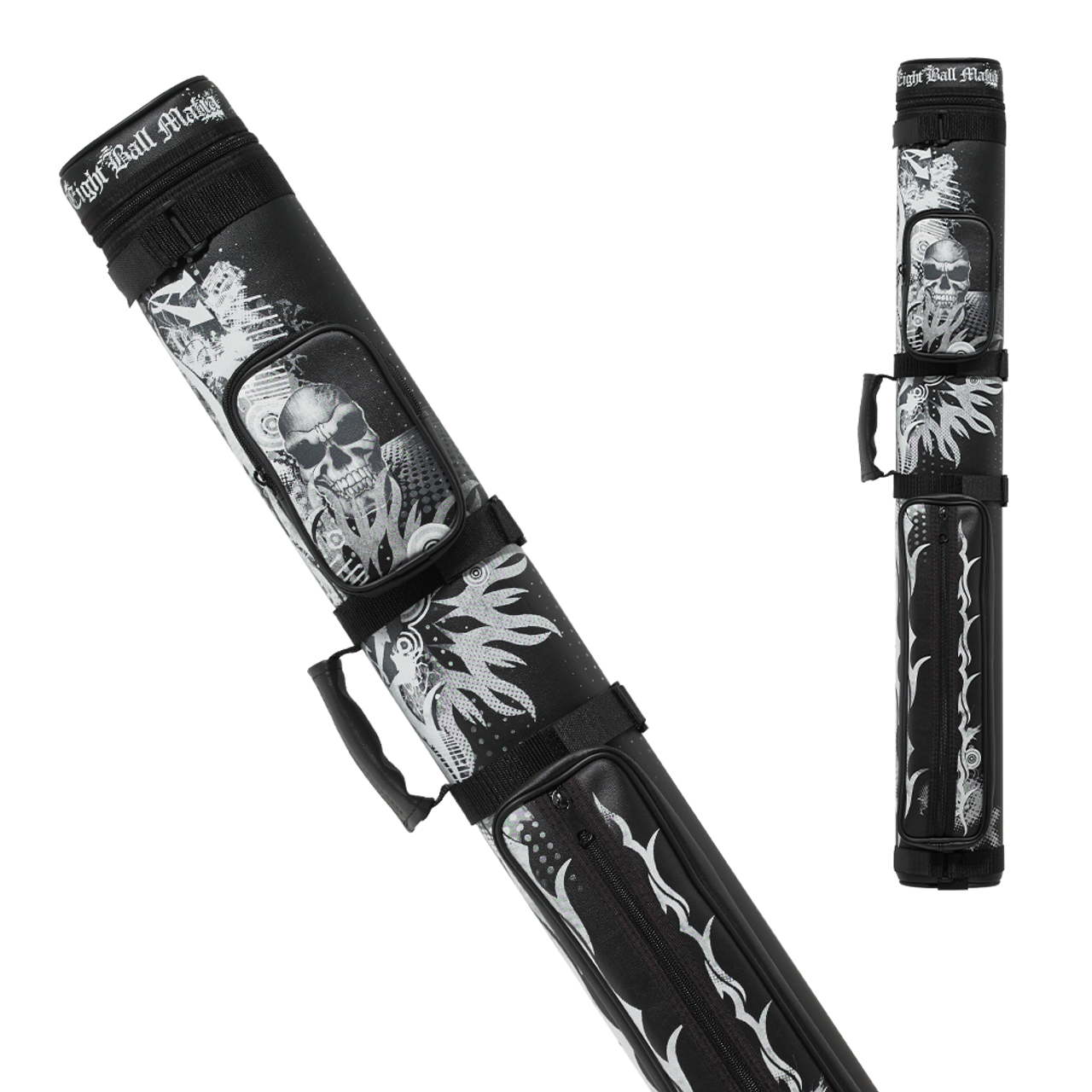 This Eight Ball Mafia cue case comes in a black color with white and grey tribal and skull designs. Built tough on the outside and soft in the inside with cushion tubes for 2 butts and 2 shaft to provide the ultimate protection. Comes with 2 spacious pockets for accessories. Adjustable shoulder strap and a handle for easy carrying.