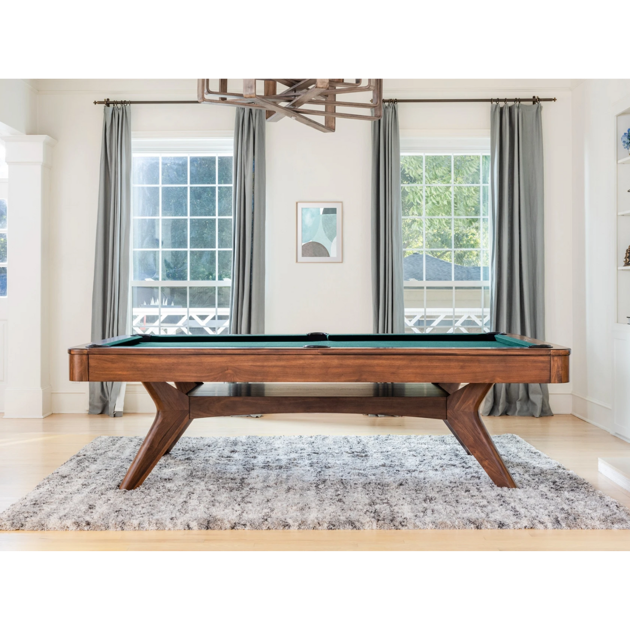 This Solid Walnut pool table features elements of mid-century modern design with completely original features. Boomerang legs, rounded corners and a shelf under the playfield make this table gorgeous and functional. The shelf sits directly under the playfield and is a great place to store game accessories. All Imperial pool tables are skillfully crafted and designed by billiard experts and enthusiasts.