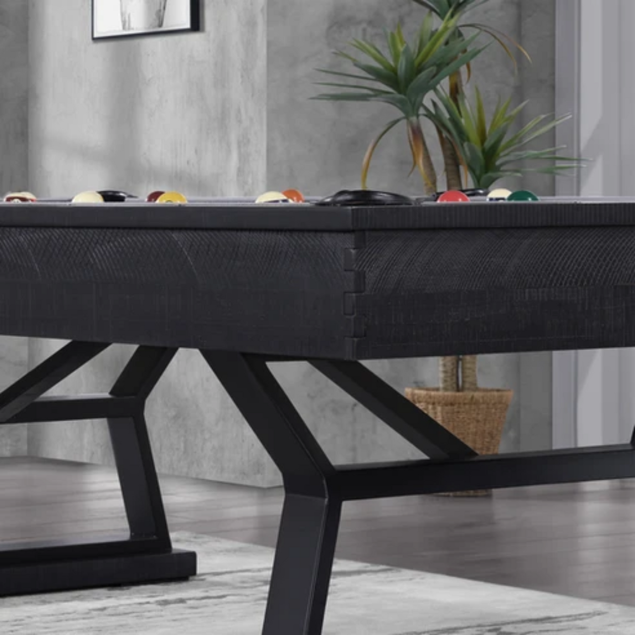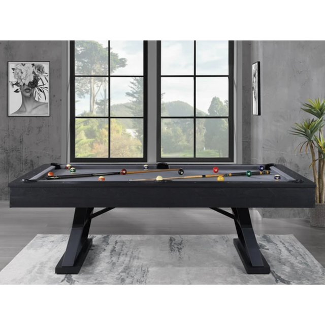 Introducing the epitome of contemporary leisure, the Durham modern industrial pool table seamlessly blends sophistication and functionality. Supported by sleek and sturdy powder-coated steel legs, and crafted of solid Pine and Acacia hardwoods, this table boasts an urban edge while ensuring stability during intense gameplay. Its alluring Ink Black finish not only adds a touch of rustic elegance but also enhances the overall aesthetic, making it a striking centerpiece for any contemporary gaming space.