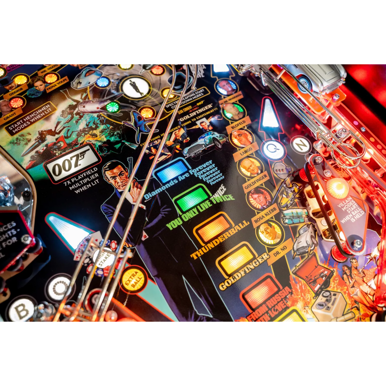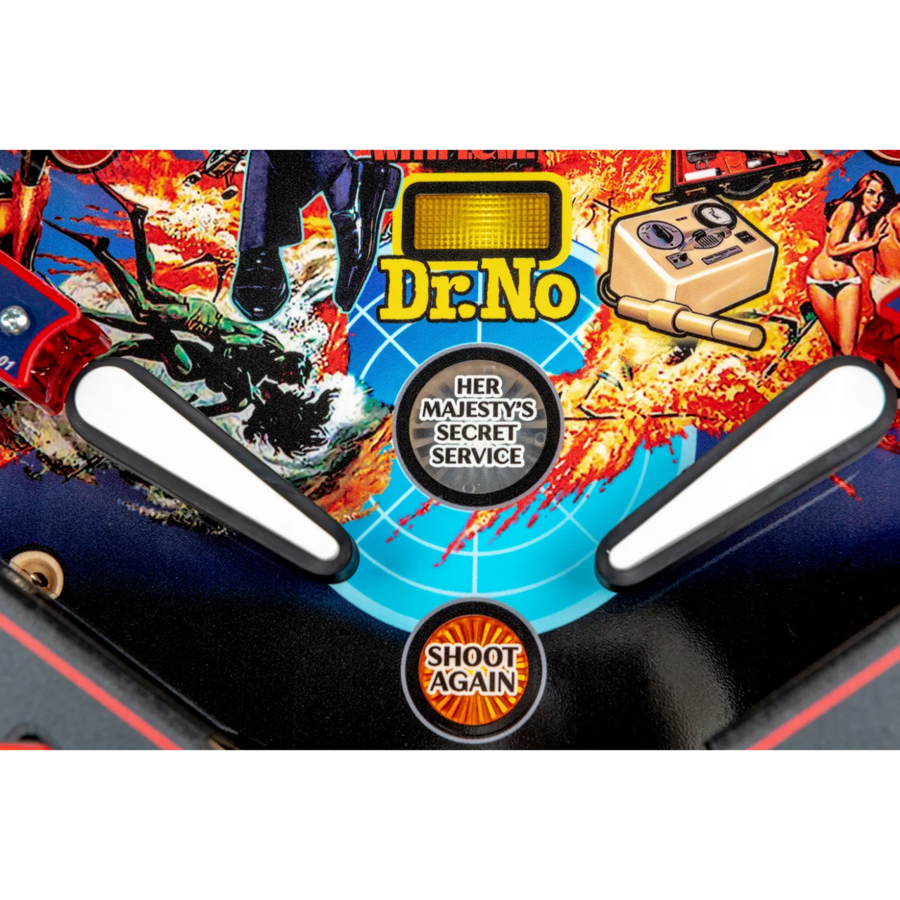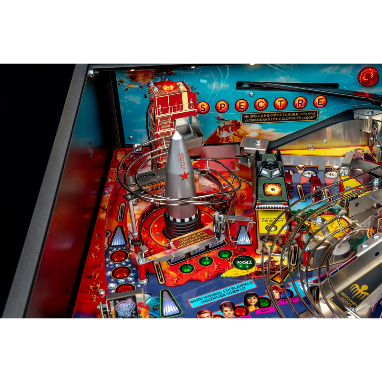 Gather gadgets from Q Branch as pinballs get ejected through the roof of a custom sculpted Aston Martin DB5. Break through the Osato Chemicals drop targets to battle SPECTRE at the Bird One rocket base. And hold your breath on the gravity defying, magnetic jetpack as it transports pinballs across the playfield.