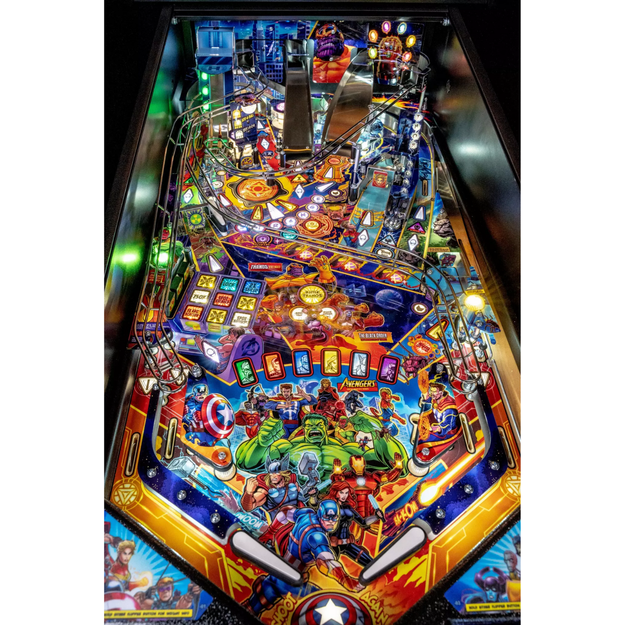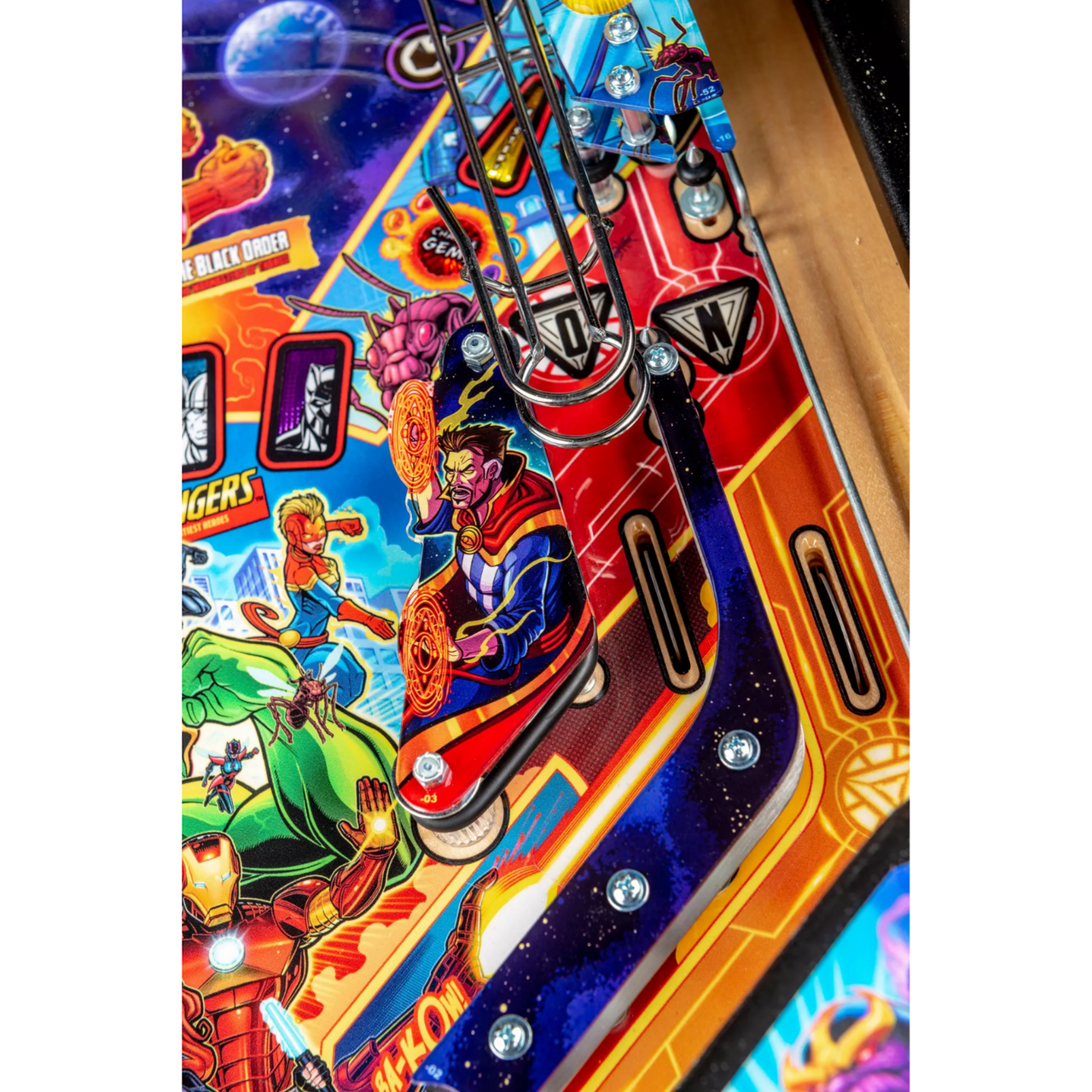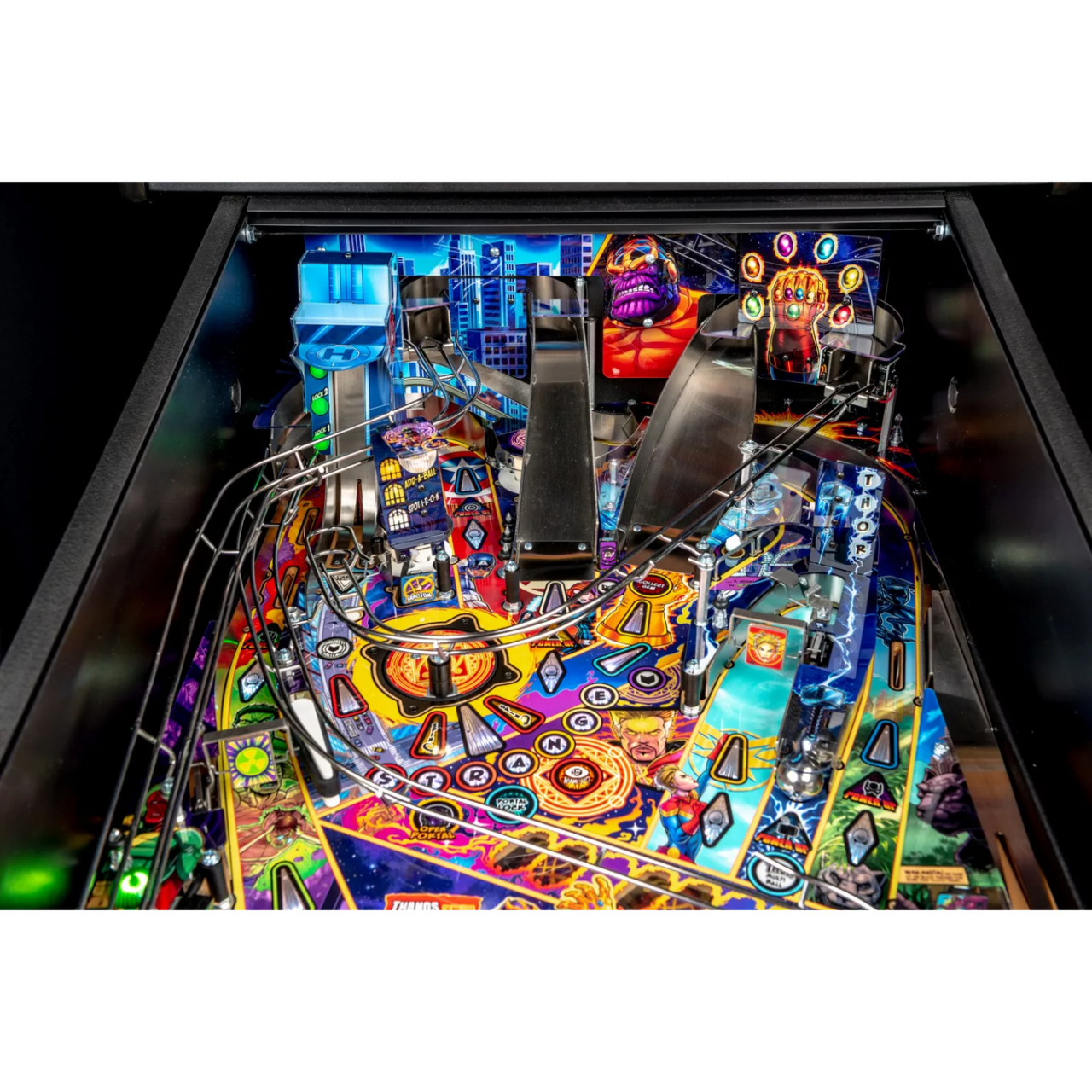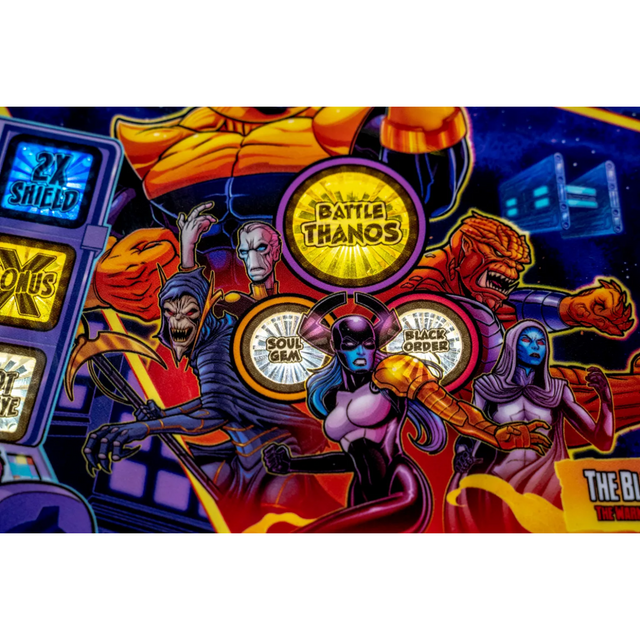 The Premium and Limited Edition models feature an interactive Dr. Strange motorized pop-up disc scoop, transporting pinballs into an underground Portal, a visible subway capable of holding and staging up to 3 balls through custom playfield windows accentuated with dynamic RGB lighting effects.  These models also include a custom sculpted Thanos Infinity Gauntlet integrated with atmospheric light-up gems, a Captain Marvel inverse gravity custom wireform ramp, and a Pym Laboratories vertical up-kicker.