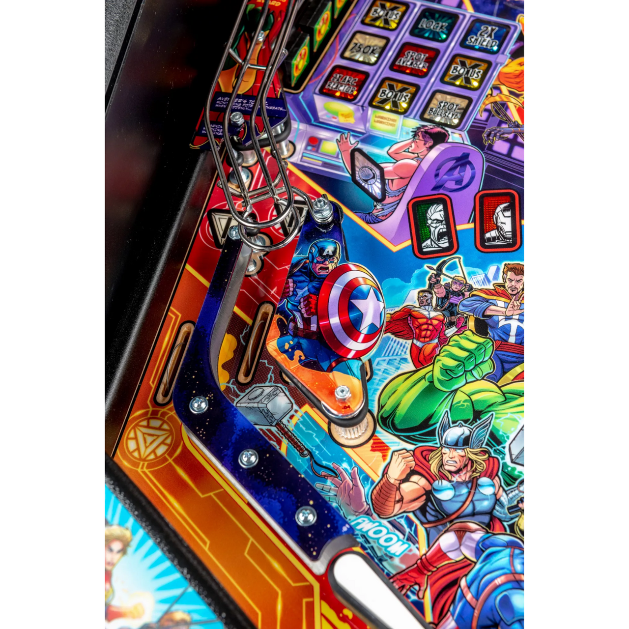 The Pro, Premium, and Limited Edition models all feature an interactive Dr. Strange spinning kinetic sling ring disc with dual direction velocity detection, aiding players on their journey to opening portals and starting Infinity Gem quests.  All models feature a gravity defying Avengers Tower magnetic lock ramp with gravitational vari-target and magnet hold, capturing pinballs in midair as players unlock Iron Man Multiball.  In addition to distinct hand-drawn artwork, all models feature an Avengers Computer Bingo grid 3-target drop bank, a Thor captive ball, Hulk spinning target, custom intricate wireform ramps, and 3 full size flippers.