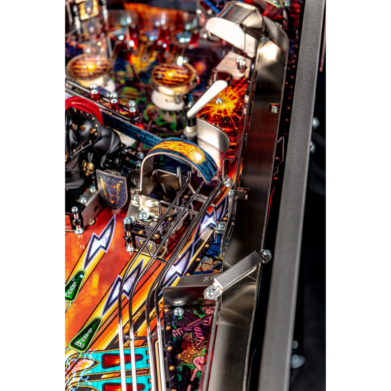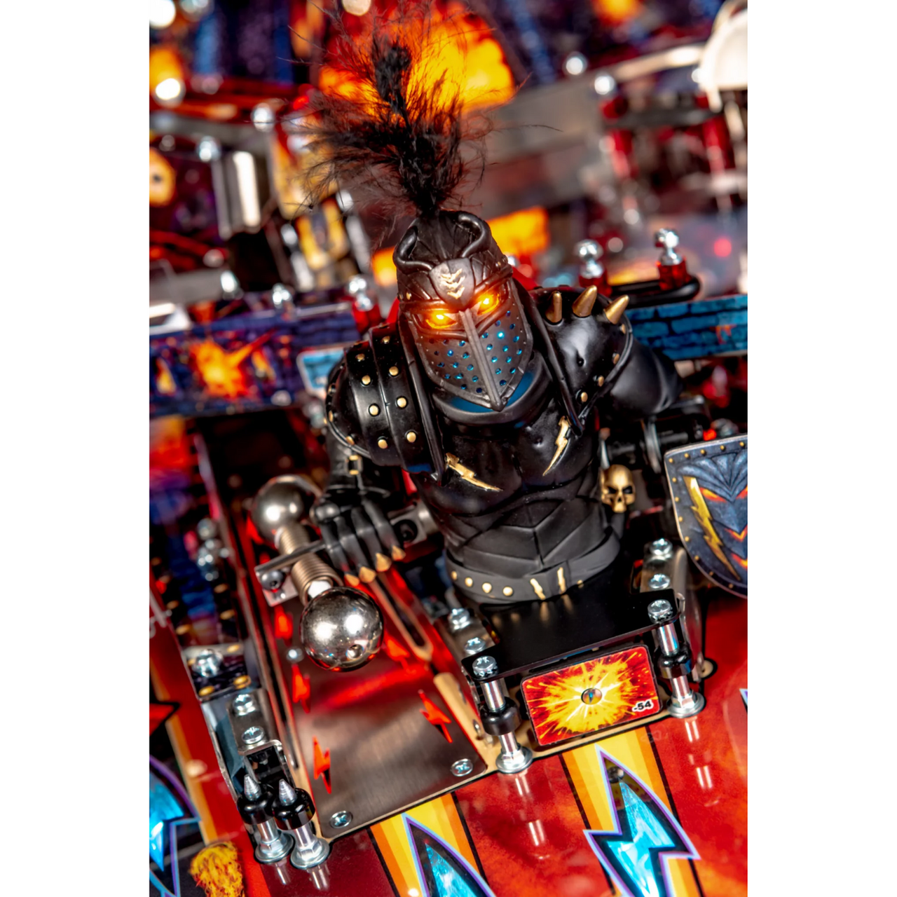 Stern’s Black Knight: Sword of Rage Premium model features stunning and distinctive hand-drawn art in homage to this pinball icon. Each game features a custom sculpted, interactive, and multi-functional Black Knight bash toy. This interactive Black Knight toy features a bi-directional motorized flail, a glowing RGB helmet with individually controllable expressive lighting to interact and taunt players with custom speech, and a sliding coil-driven shield that will bash and block your shots.