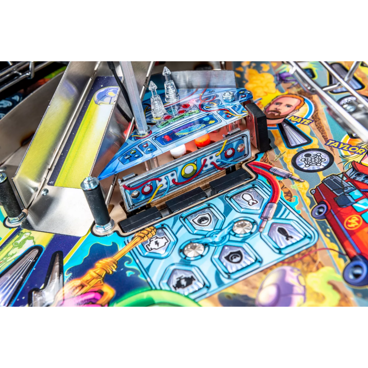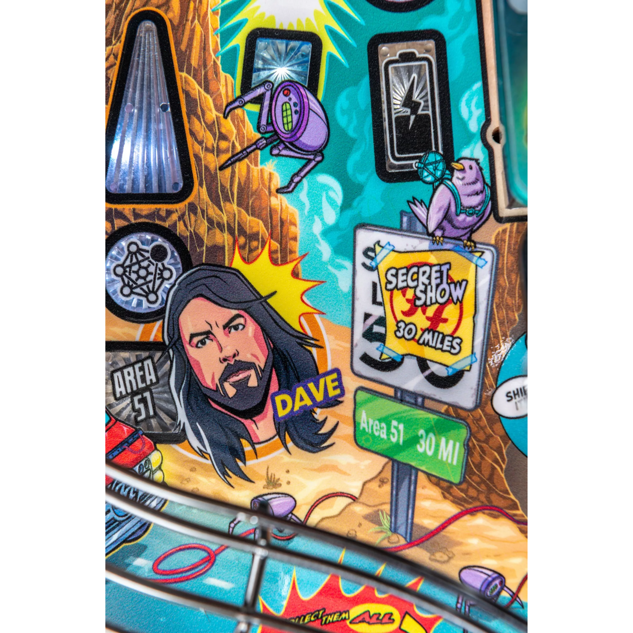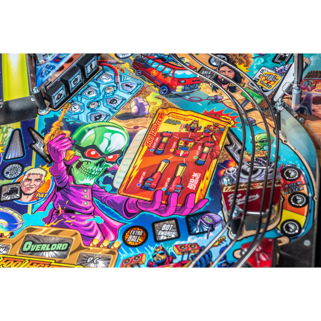 More than two years in the making and with creative input from the band’s own Dave Grohl, Nate Mendel, Pat Smear, Chris Shiflett, Rami Jaffee, and the late, great Taylor Hawkins, Stern’s Foo Fighters is a top-shelf pinball machine—and so much more. An entire new universe has been developed with jaw-dropping hand-drawn artwork and custom animations including “Foo Fighters Saturday Morning Action Time!”—a fictional TV series chronicling the band’s quest to save rock and roll… AND THE WORLD! Join Foo Fighters on this rescue mission to thwart the evil, mysterious alien Overlord and his army of bots. Search the Area 51 upper playfield to break into and unleash pinball chaos. Jump in the van for a righteous tour of duty to save humanity from extinction and let rock rule!