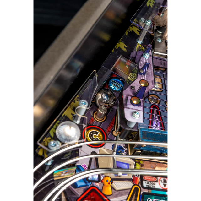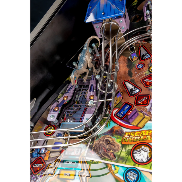 The Premium model features an amazing animatronic ball-eating, ball-throwing T. Rex that interacts with the ball and the player. These models also include an interactive Raptor and Raptor Pen featuring a ball-lock mechanism guarded by a motorized gate. The action does not let up with unique mosquito-in-amber pop bumpers and a custom metal horizontal helicopter spinner.