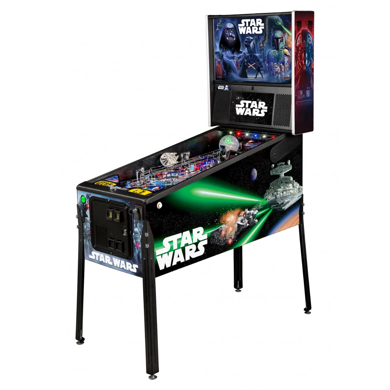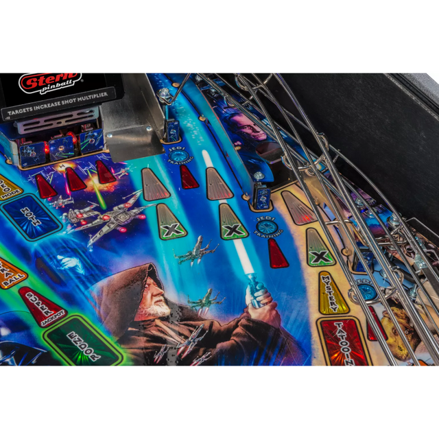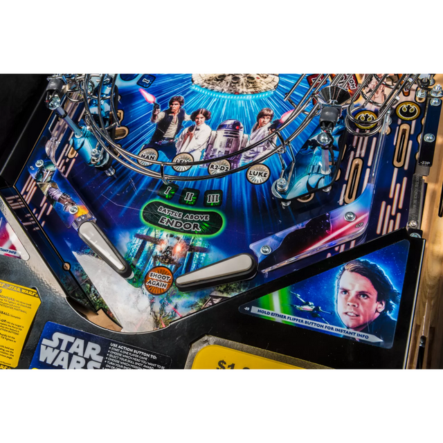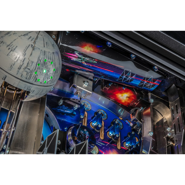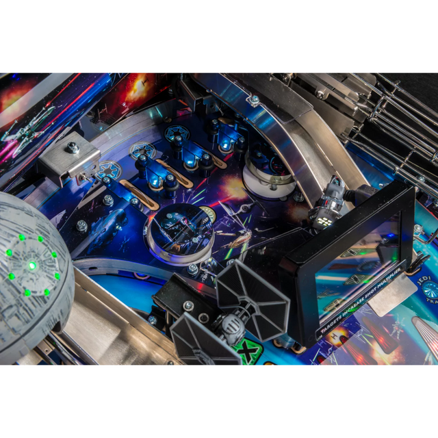 Star Wars pinball machines will be available in Pro, and Premium models. The game will immerse players in the dynamic and challenging Star Wars pinball environment as they battle to restore justice to the Galaxy. Stern’s Star Wars Premium machines are packed with features that provide an irresistible game experience. The game includes select speech and footage from the original Star Wars trilogy; color-changing LED-lighted inserts; a sculpted LED-lit Millennium Falcon; and a sculpted TIE Fighter. The Premium model also feature two LCD screens, an exploding Death Star interactive display, and a hyperspace ramp.